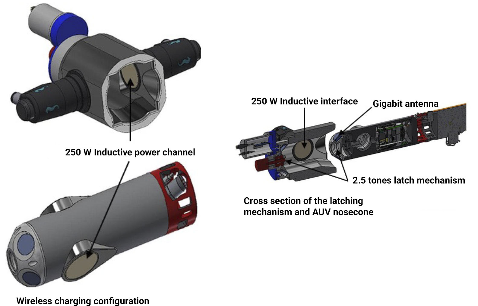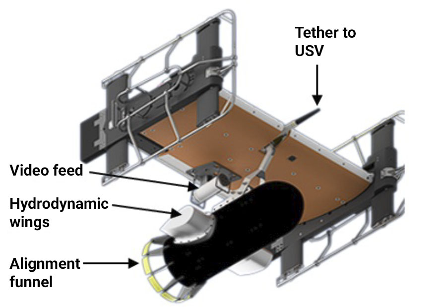 →A fully submerged, USV-towed docking station that allows AUVs to recharge and offload data while the system is in motion.